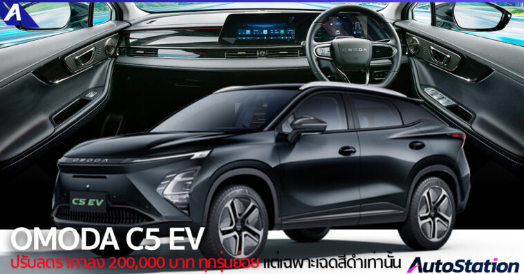 โอโมดา แอนด์ เจคู (ประเทศไทย) หรือ OMODA & JAECOO (Thailand) ประกาศปรับลดราคาจำหน่าย OMODA C5 EV รถยนต์ไฟฟ้า 100% ในรูปแบบเอสยูวีลงทั้ง 2 รุ่นย่อยลงถึง 200,000 บาท เฉพาะเฉดสีตัวถังสีดำเท่านั้น